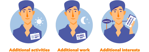 If there is an additional interest, the scientific employee must fill in the additional activities form (which contains a section on additional interests) and send it to the dean via the head of their department. The dean ensures that permission is requested from the Board of the UG.